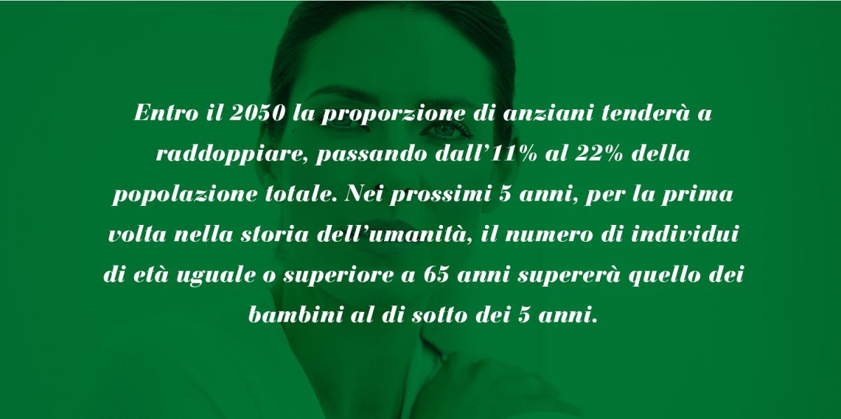 Entro il 2050 la proporzione di anziani tenderà a raddoppiare, passando dall’11% al 22% della popolazione totale. Nei prossimi 5 anni, per la prima volta nella storia dell’umanità, il numero di individui di età uguale o superiore a 65 anni supererà quello dei bambini al di sotto dei 5 anni.