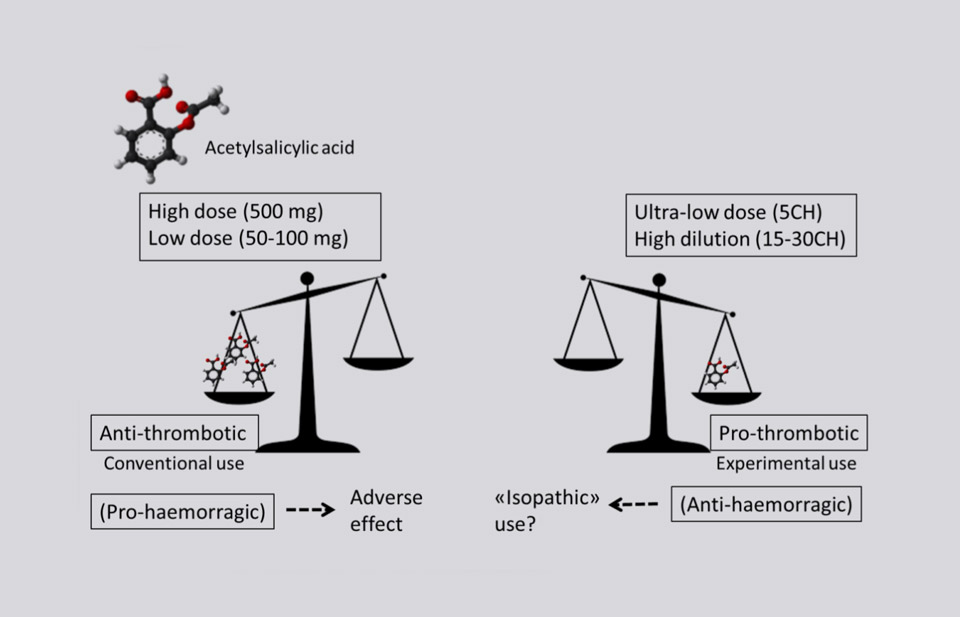 Sono stati condotti degli studi sull’acido acetilsalicilico in dosi omeopatiche. Anche per quanto riguarda l’acido acetilsalicilico è stato osservato che l’effetto anti-trombotico delle alte dosi, si inverte in effetto pro-trombotico nelle dosi omeopatiche (Ultra-low dose 5CH; High diluition 15-30CH).